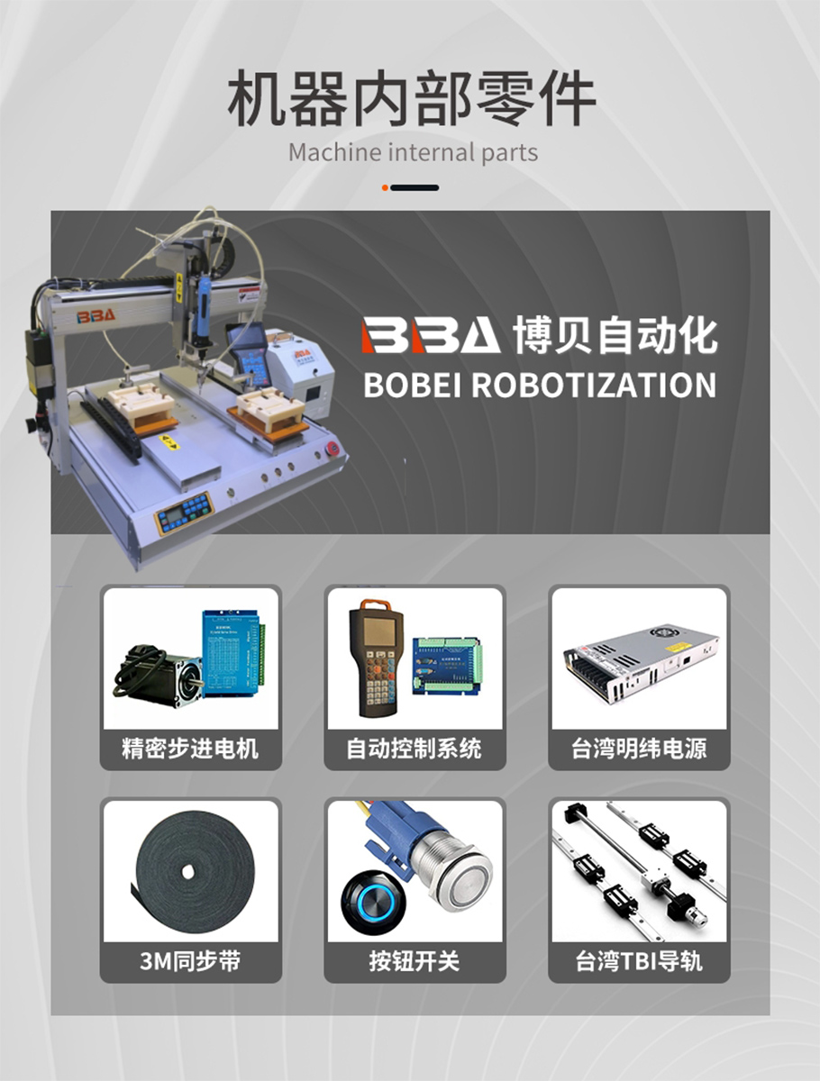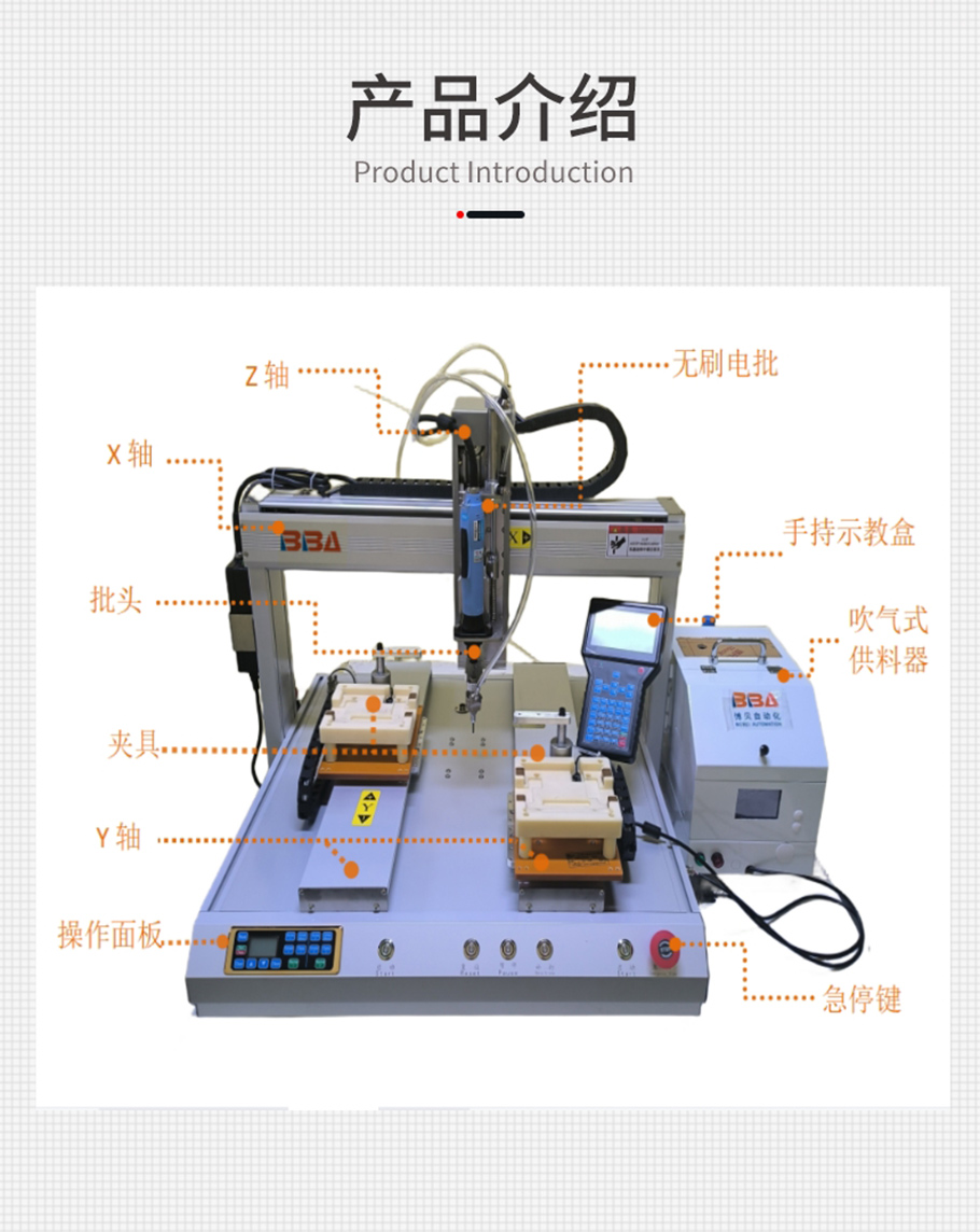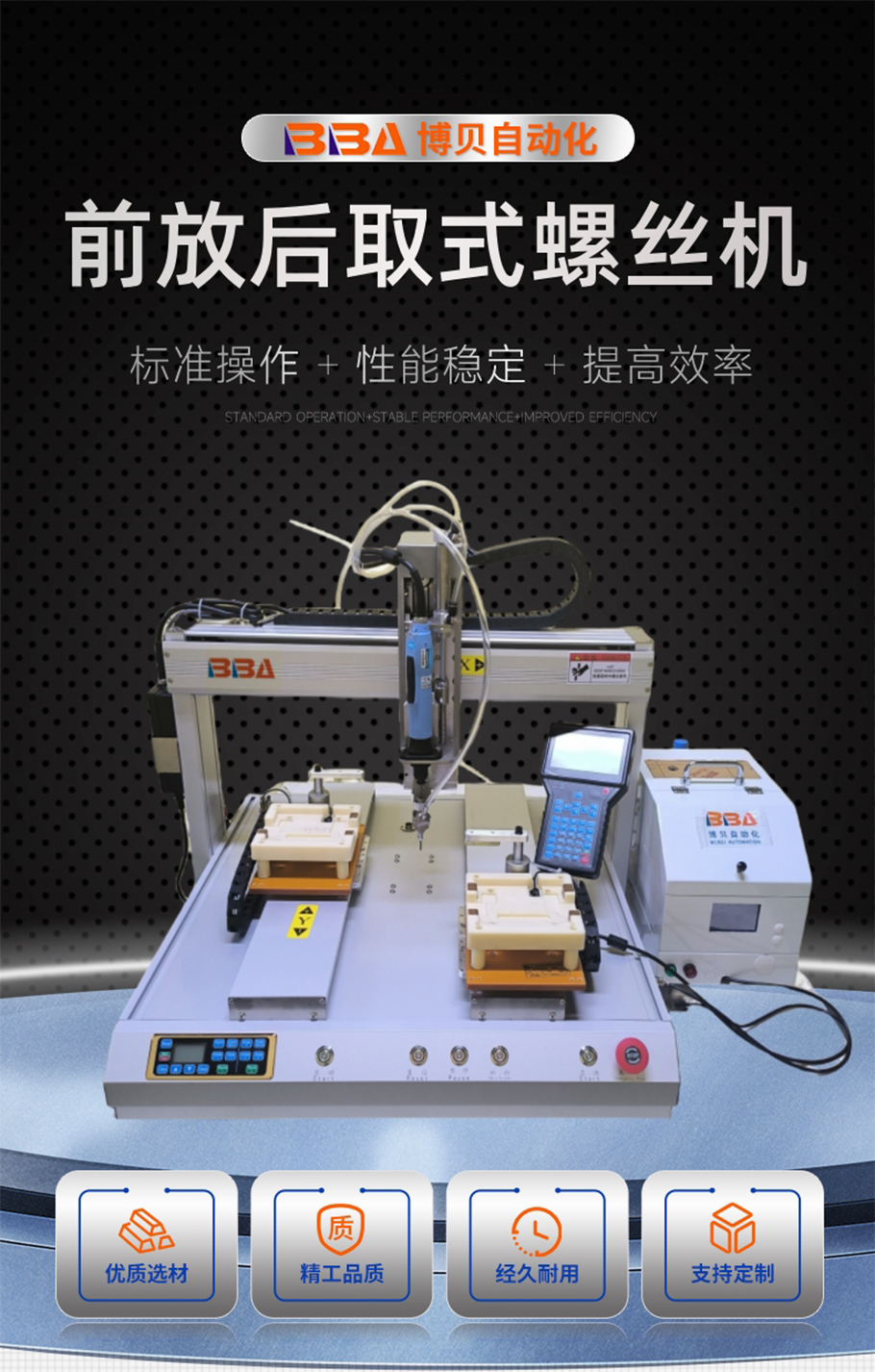 博貝自動化,是專門從事自動鎖螺絲機,自動擰螺絲機,自動打螺絲機的專業生產廠家。機(jī)器樣式多樣(yàng),亦可根(gēn)據產品定製機型。有單工位(wèi),雙工位,多工(gōng)位,在線式,單頭,雙頭及多(duō)頭(tóu)螺絲機供不同產品的(de)自動鎖螺絲的(de)需求。更多信息,請谘(zī)詢熱線:18617279323